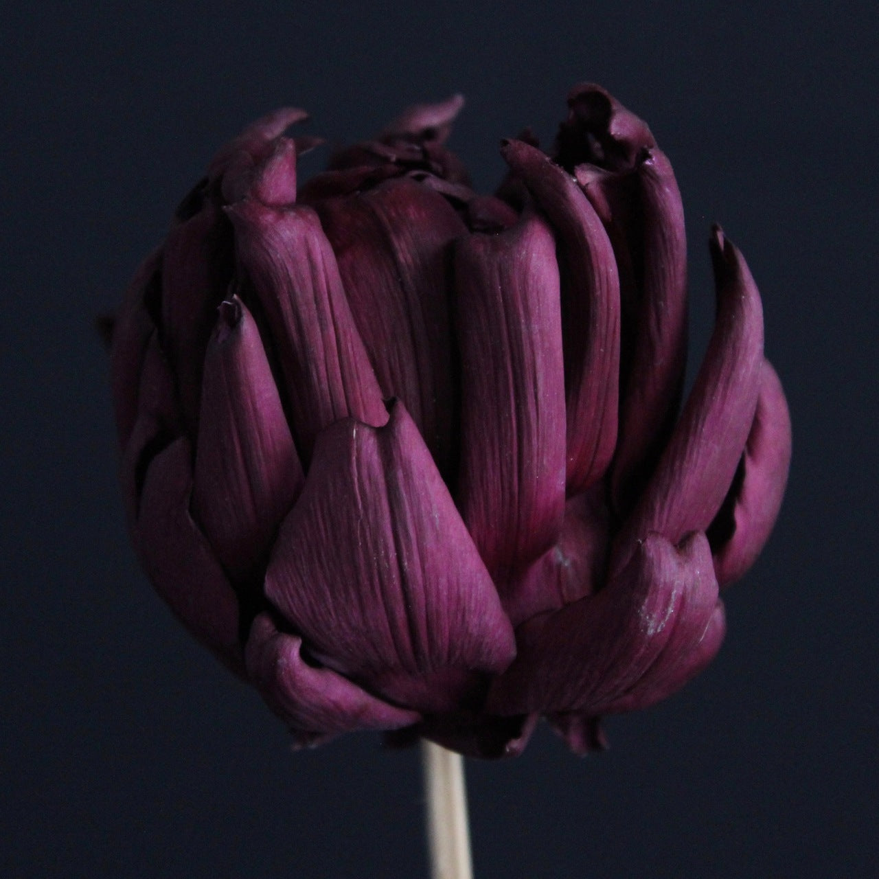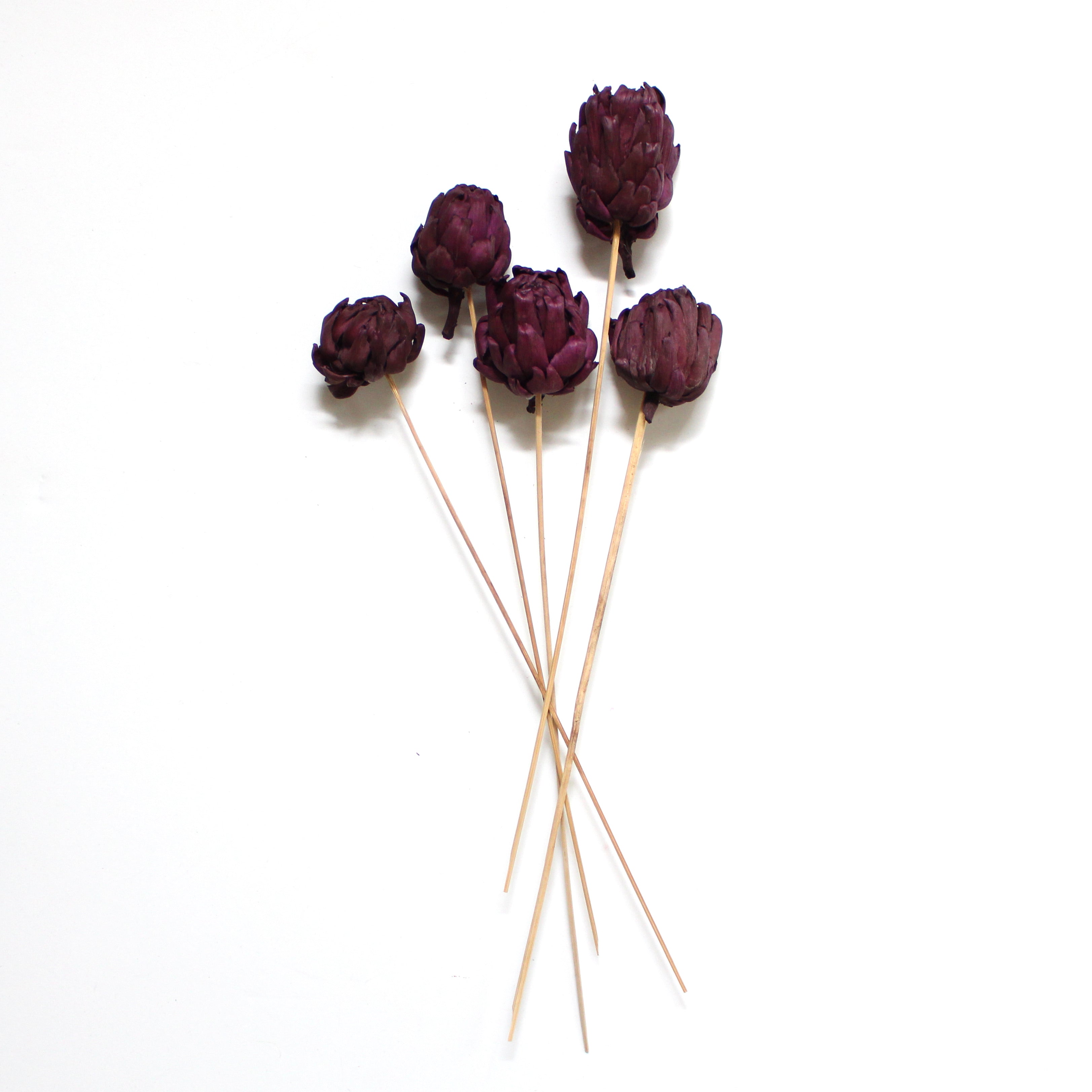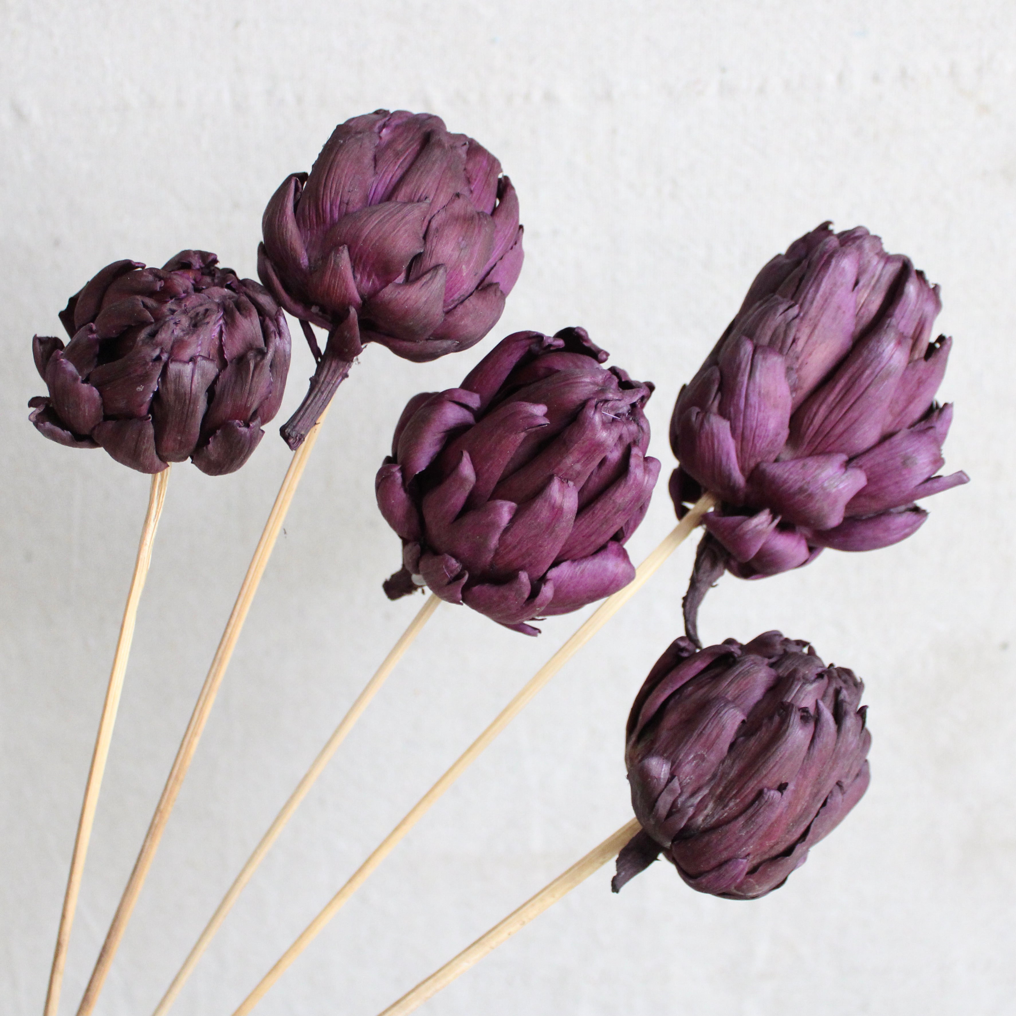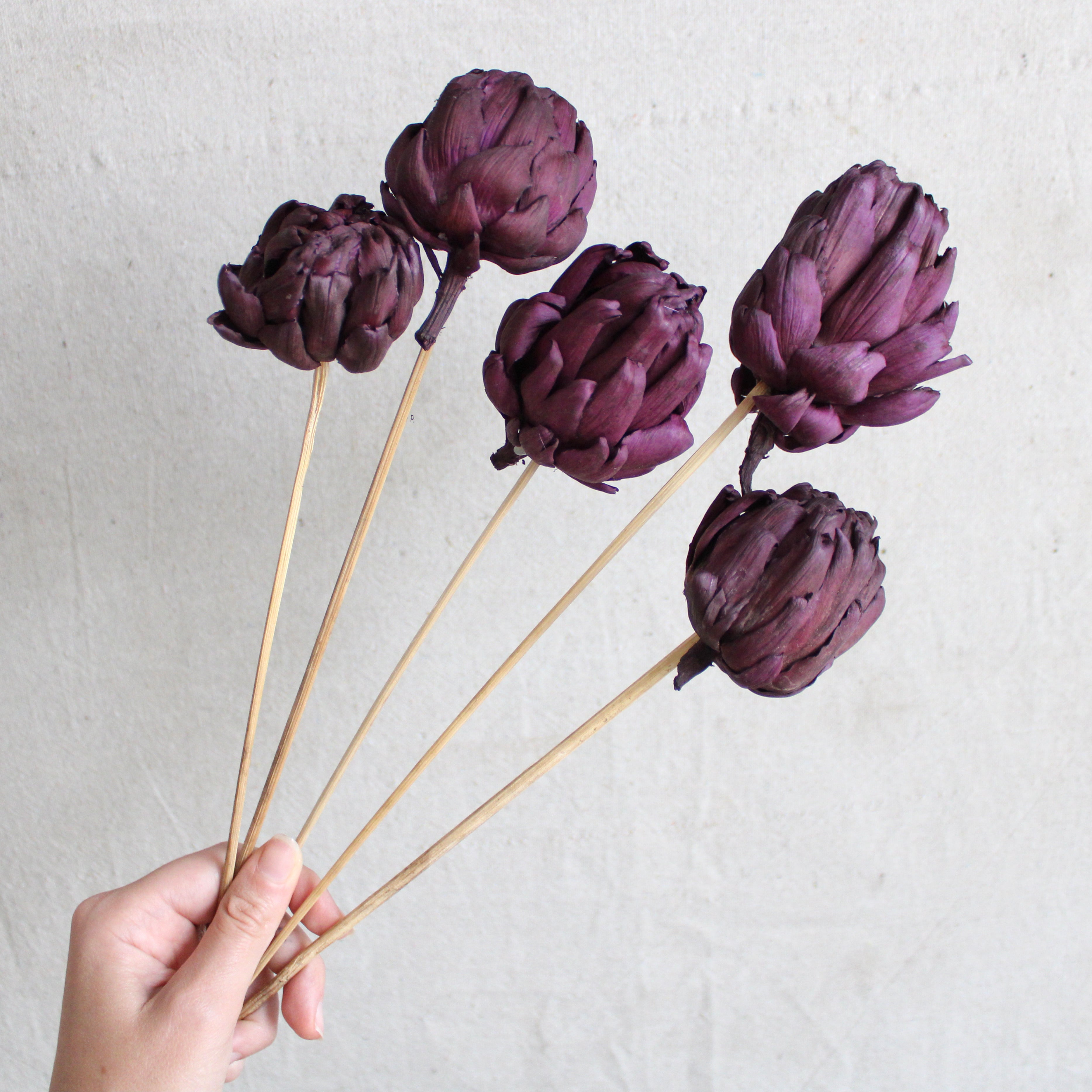 Dark purple dried artichokes sit atop reed stems. Pluck from the stem to use just the head in a wreath or keep stemmed for arranging a kitchen bouquet.