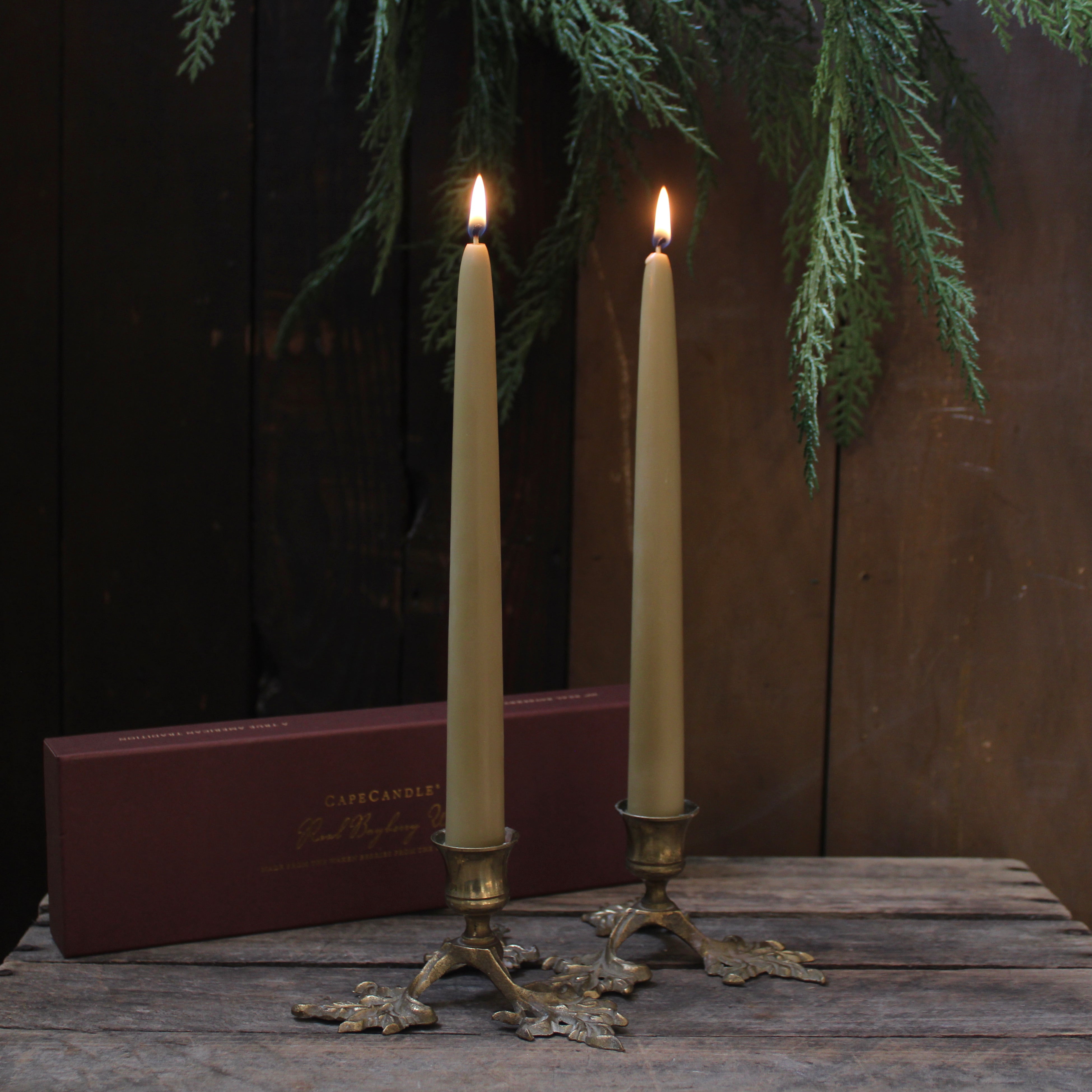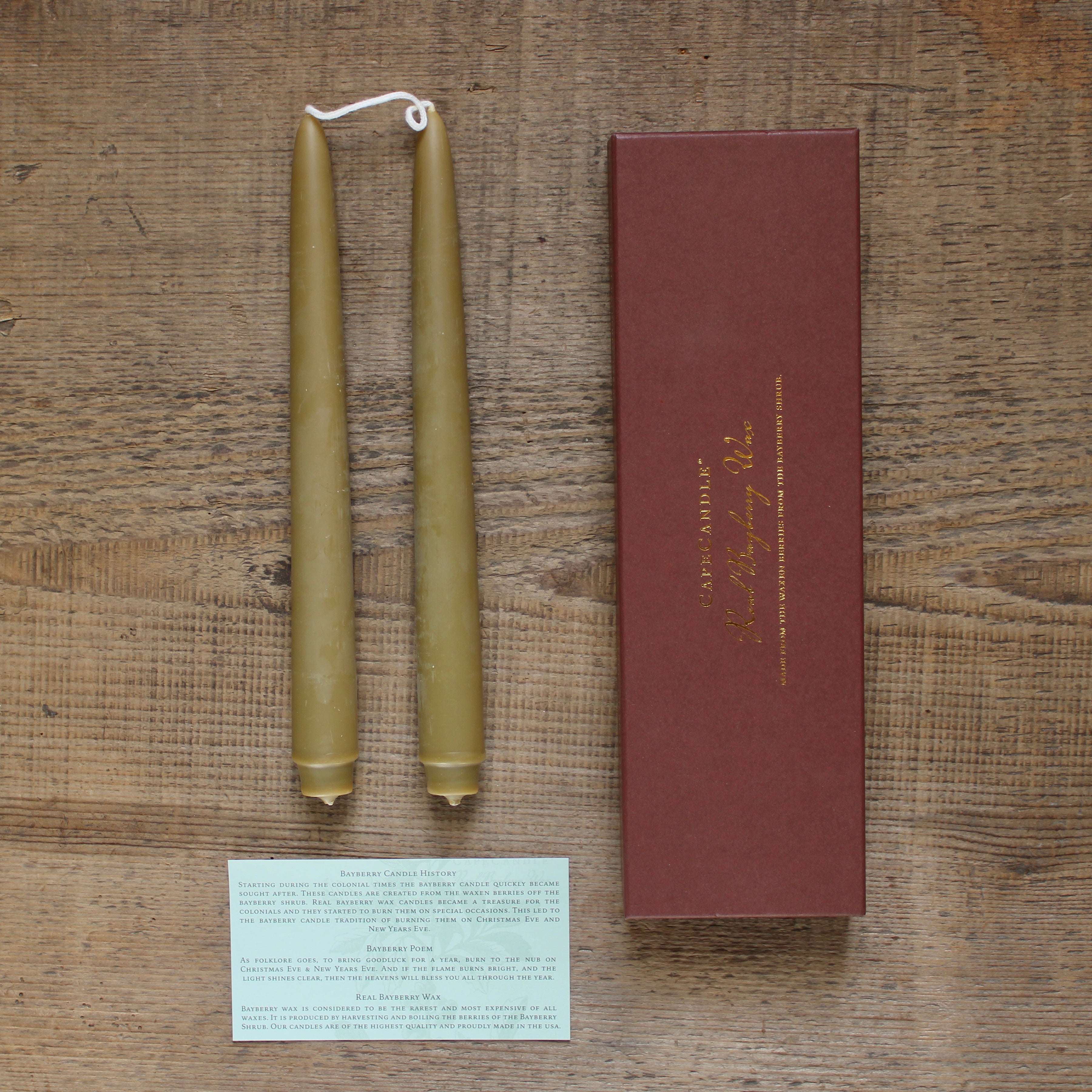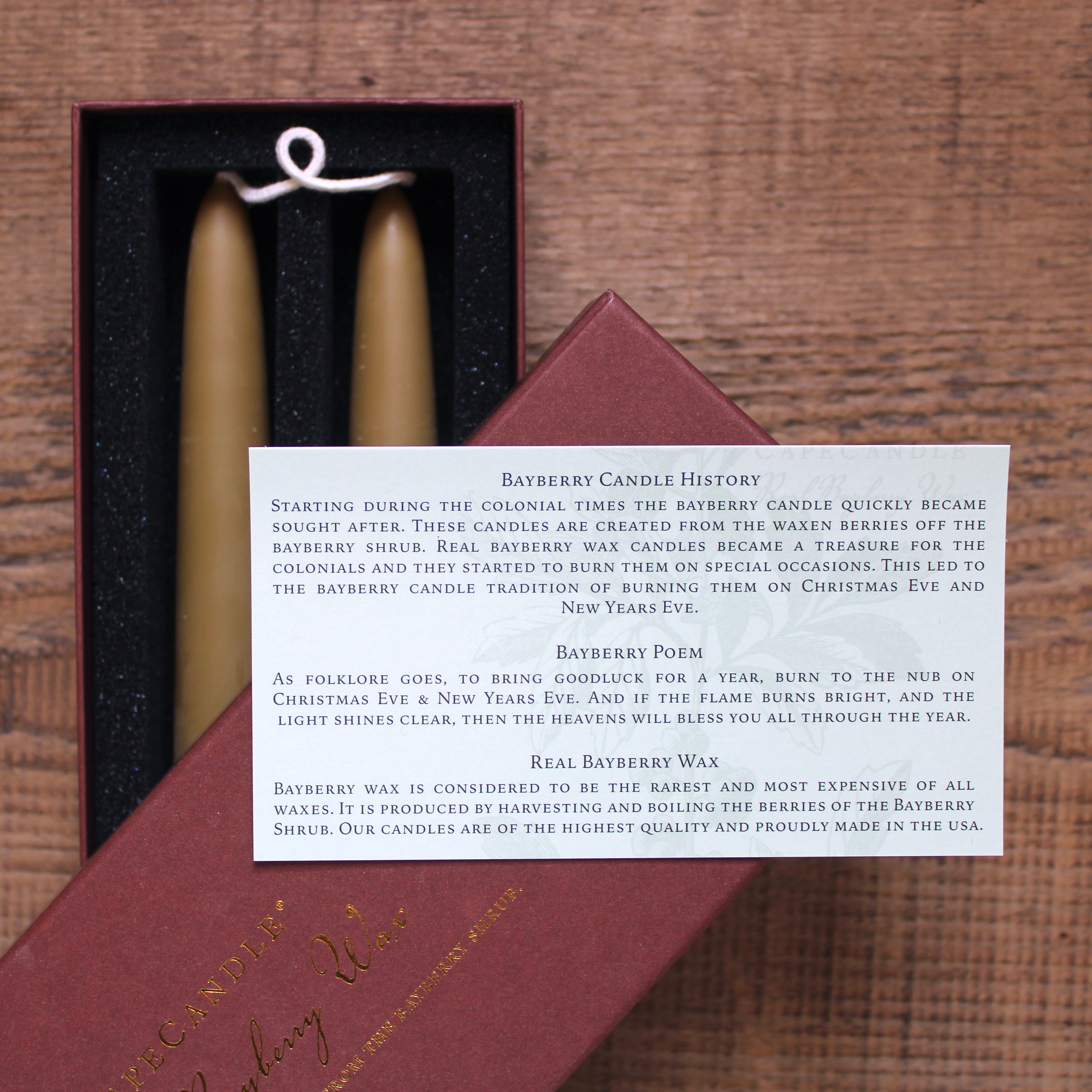 Nicely gift-boxed, these genuine bayberry candles, made from the wax on the berries of the bayberry shrub, have been the traditional holiday candle since colonial times. Burned to the nub on Christmas and New Year's Eve, they bring good luck for the coming year. Authentic Bayberry Candles with the story of the Bayberry Candle on the gift box. By nature, true bayberry candles have very little scent compared to artificially scented bayberry candles.