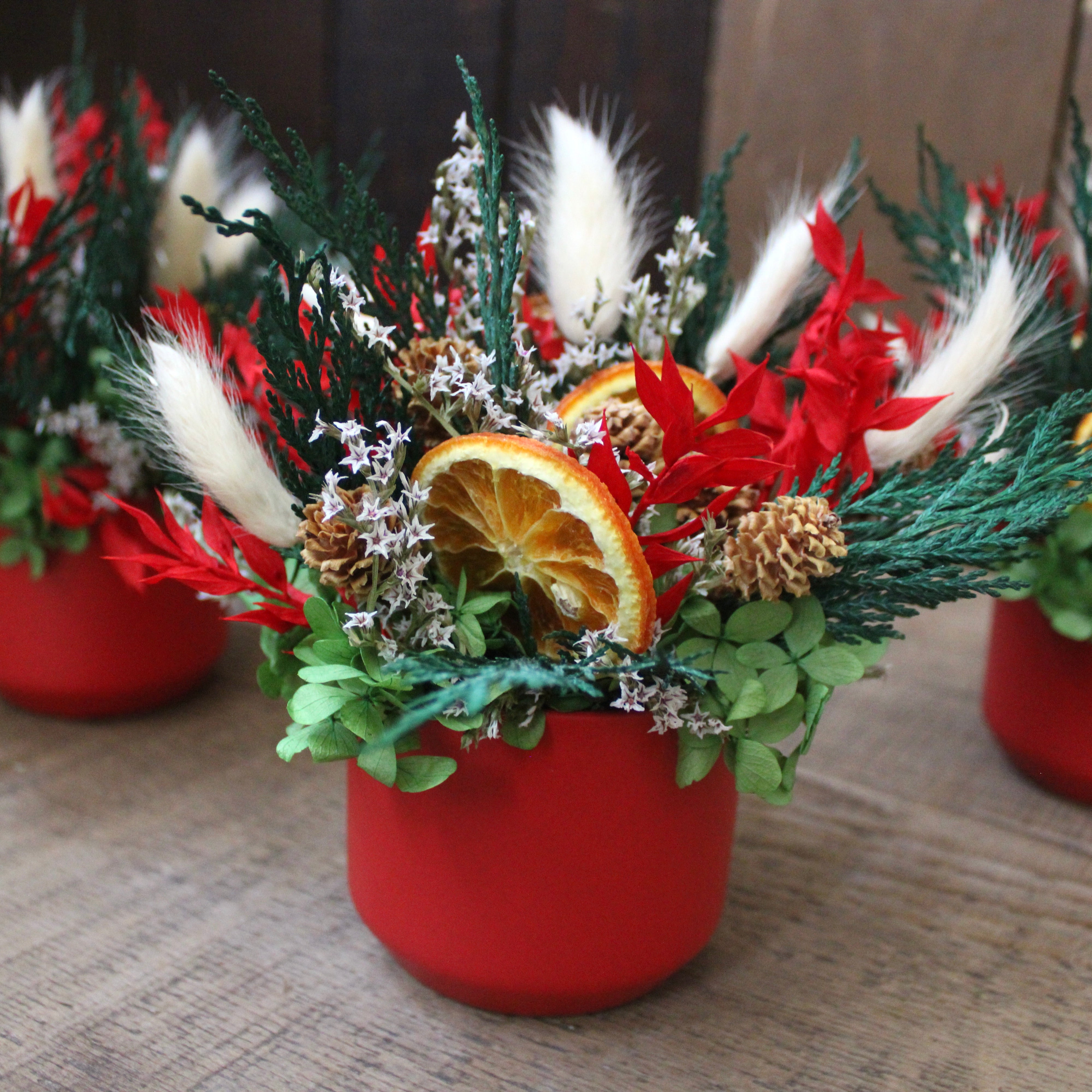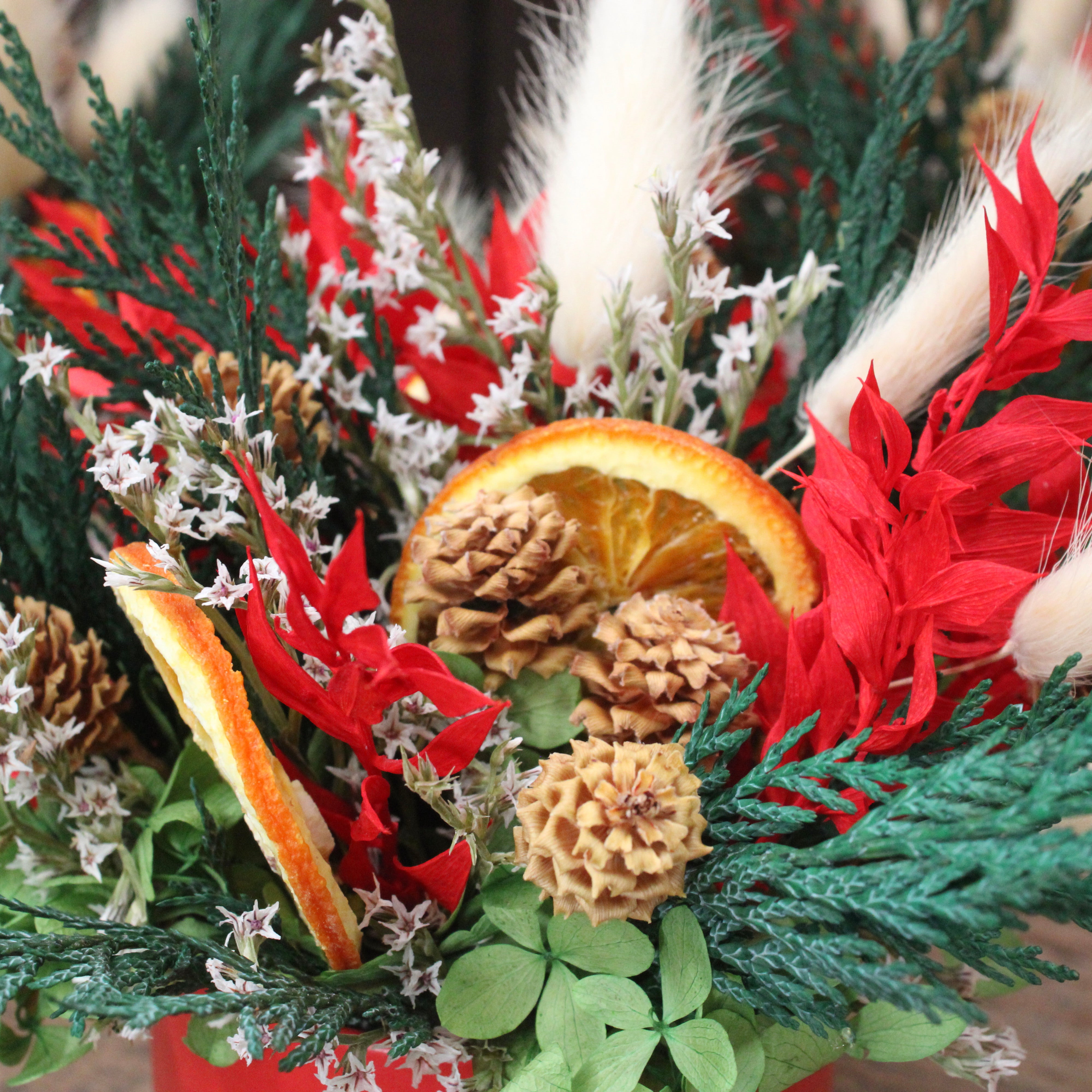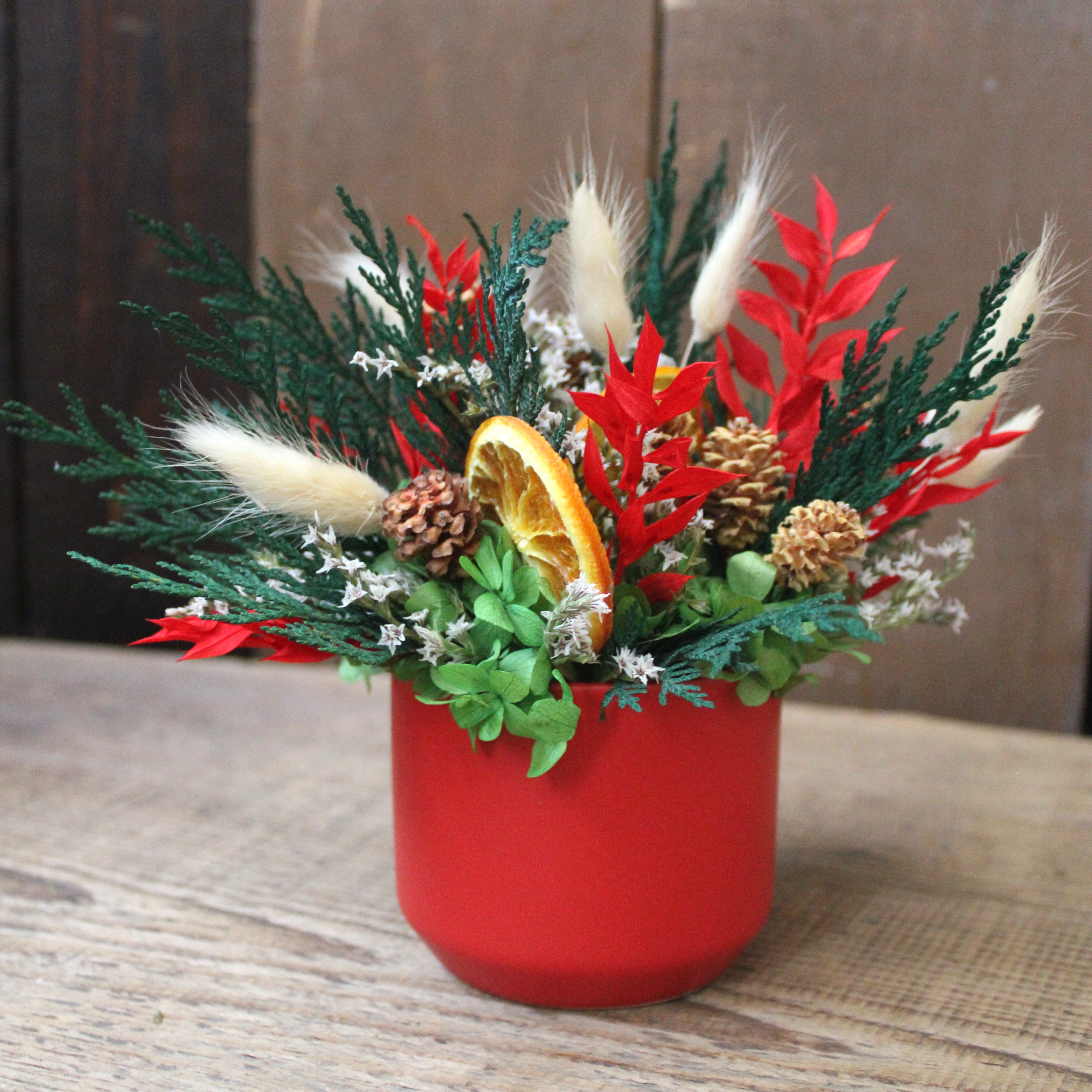Be Merry Cup Arrangement features hydrangea, bunny tail, orange slice, ruscus, German statice, cedar, and salignum.
