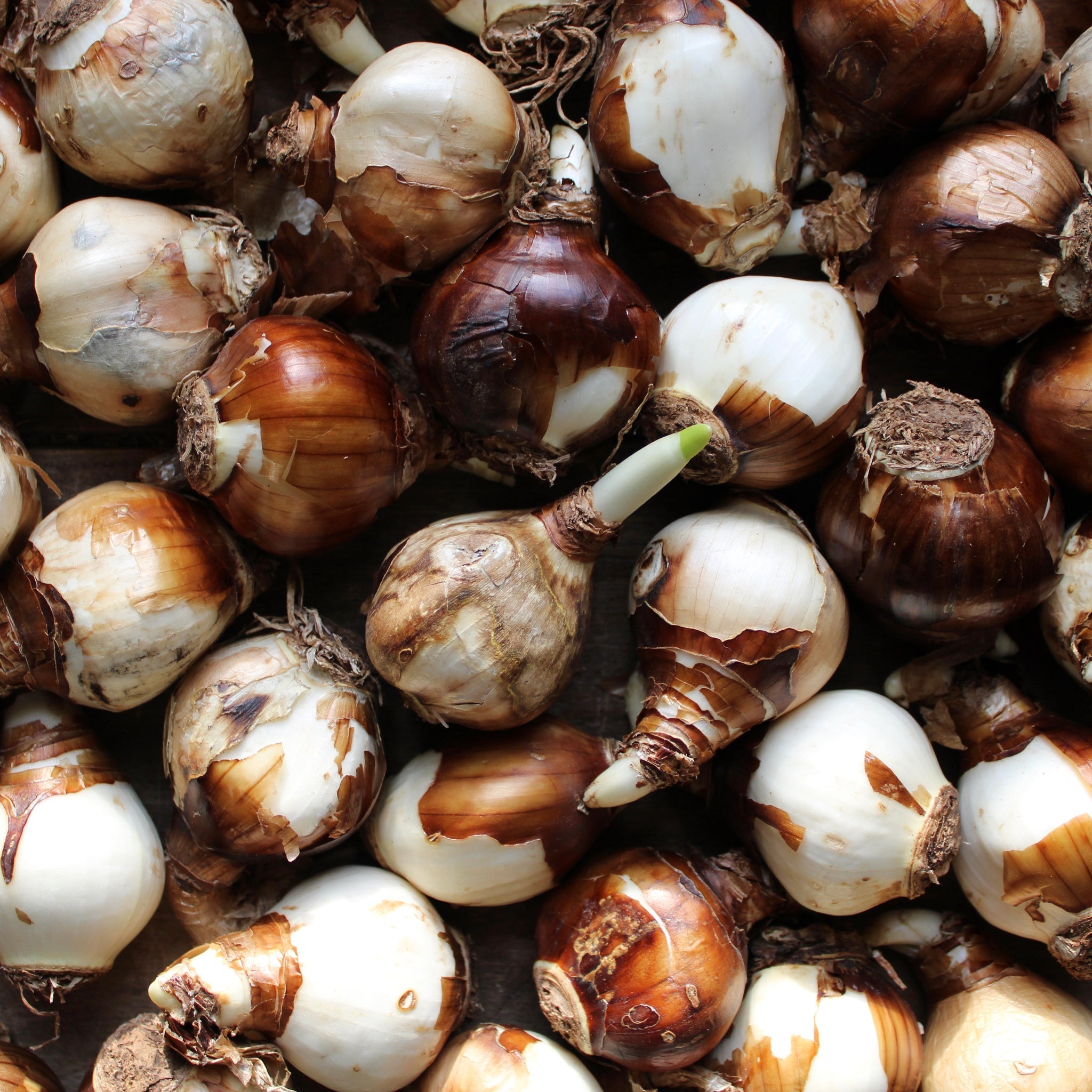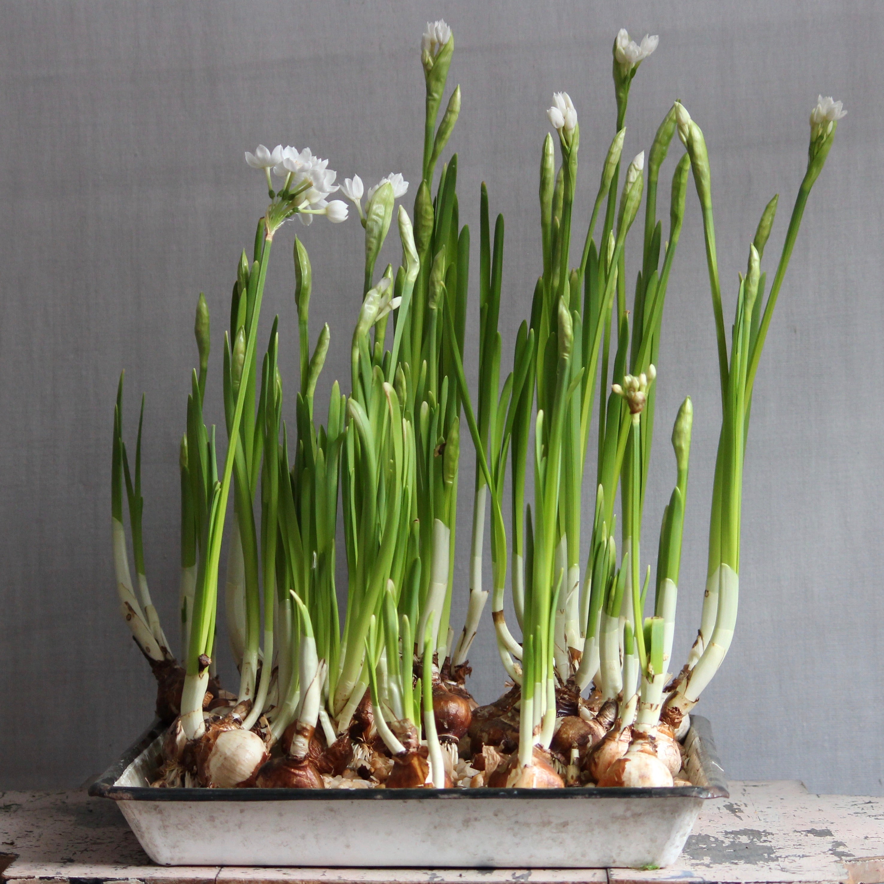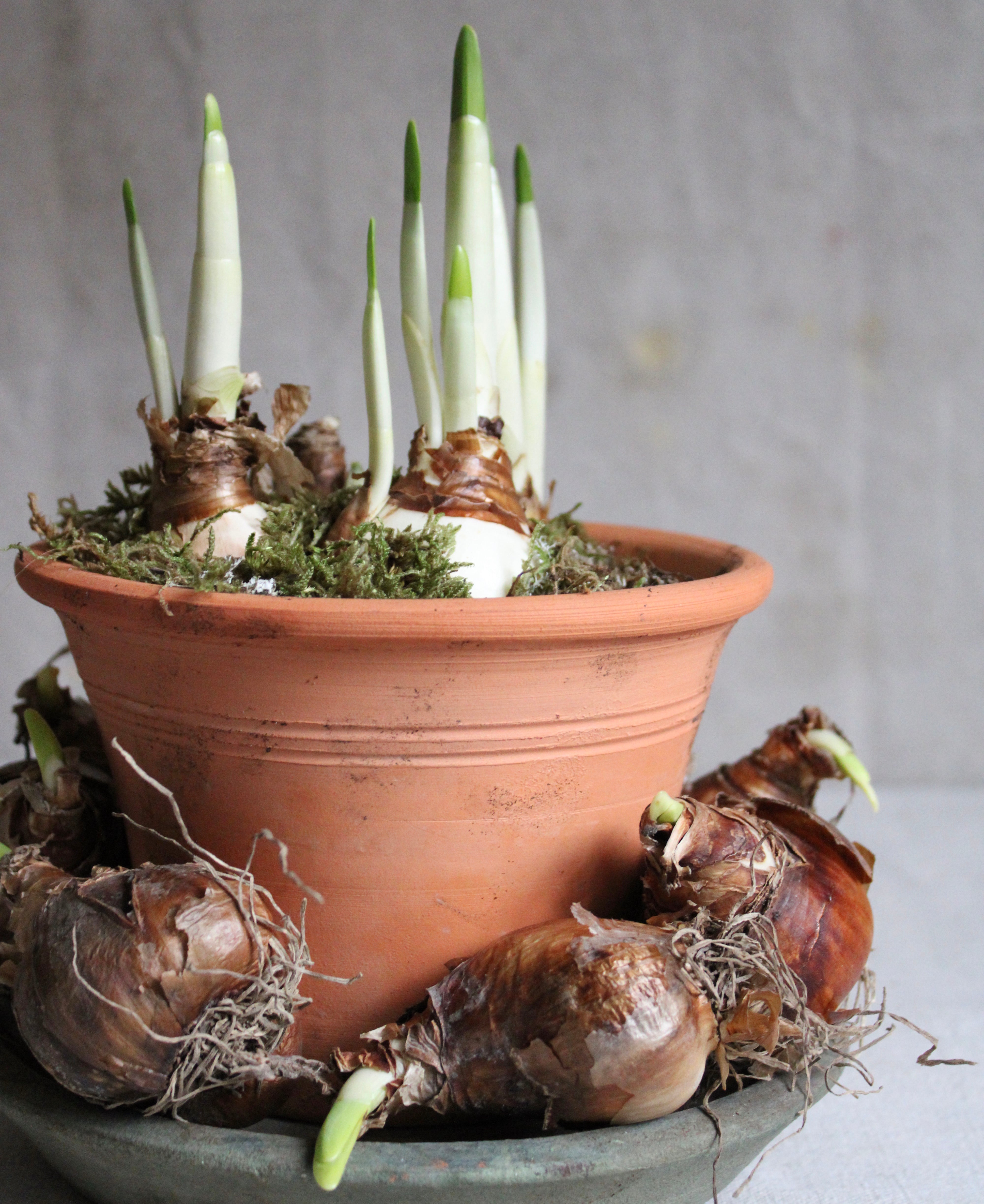 Place course sand or decorative gravel over potting soil to keep roots from pushing the bulbs out of the pot as they grow.