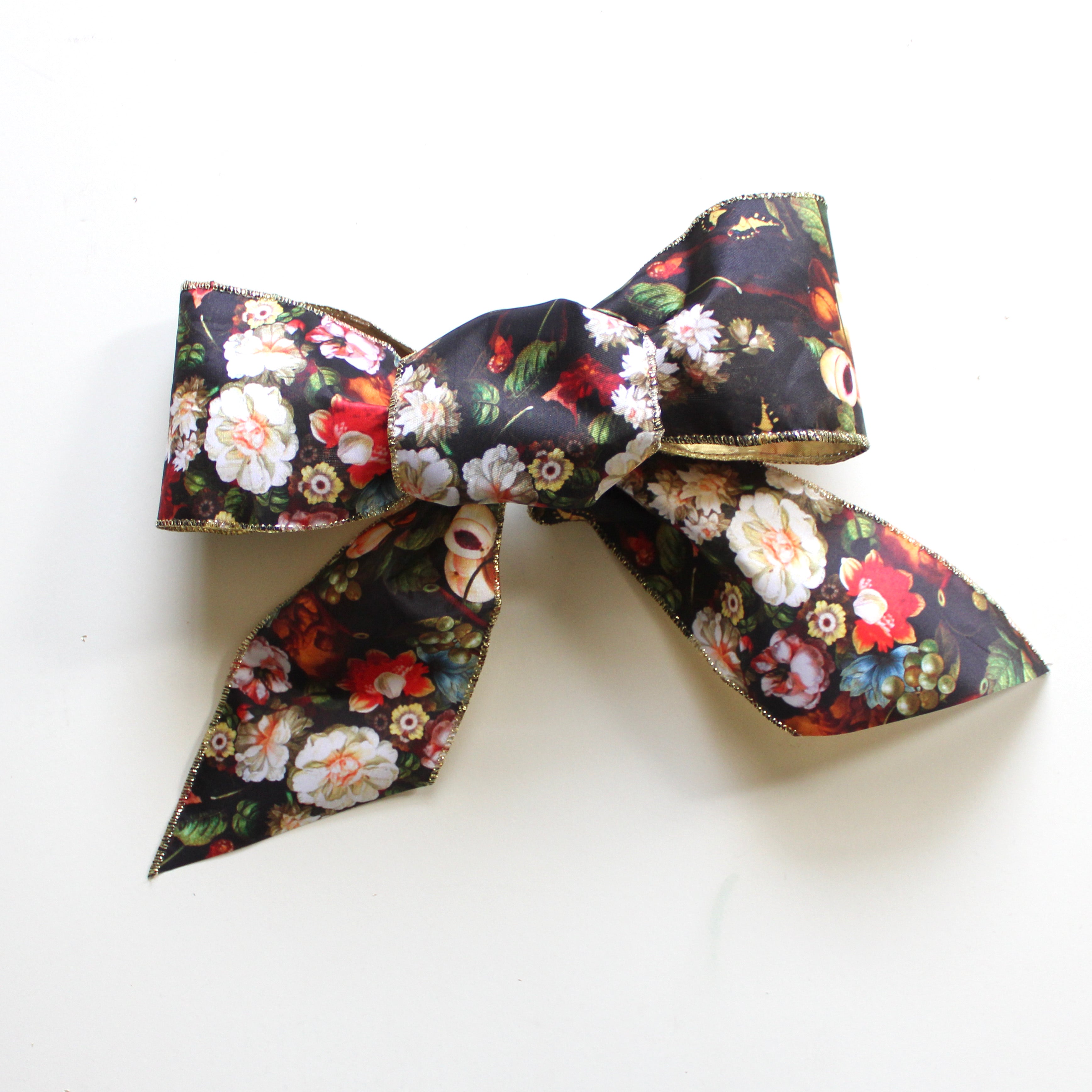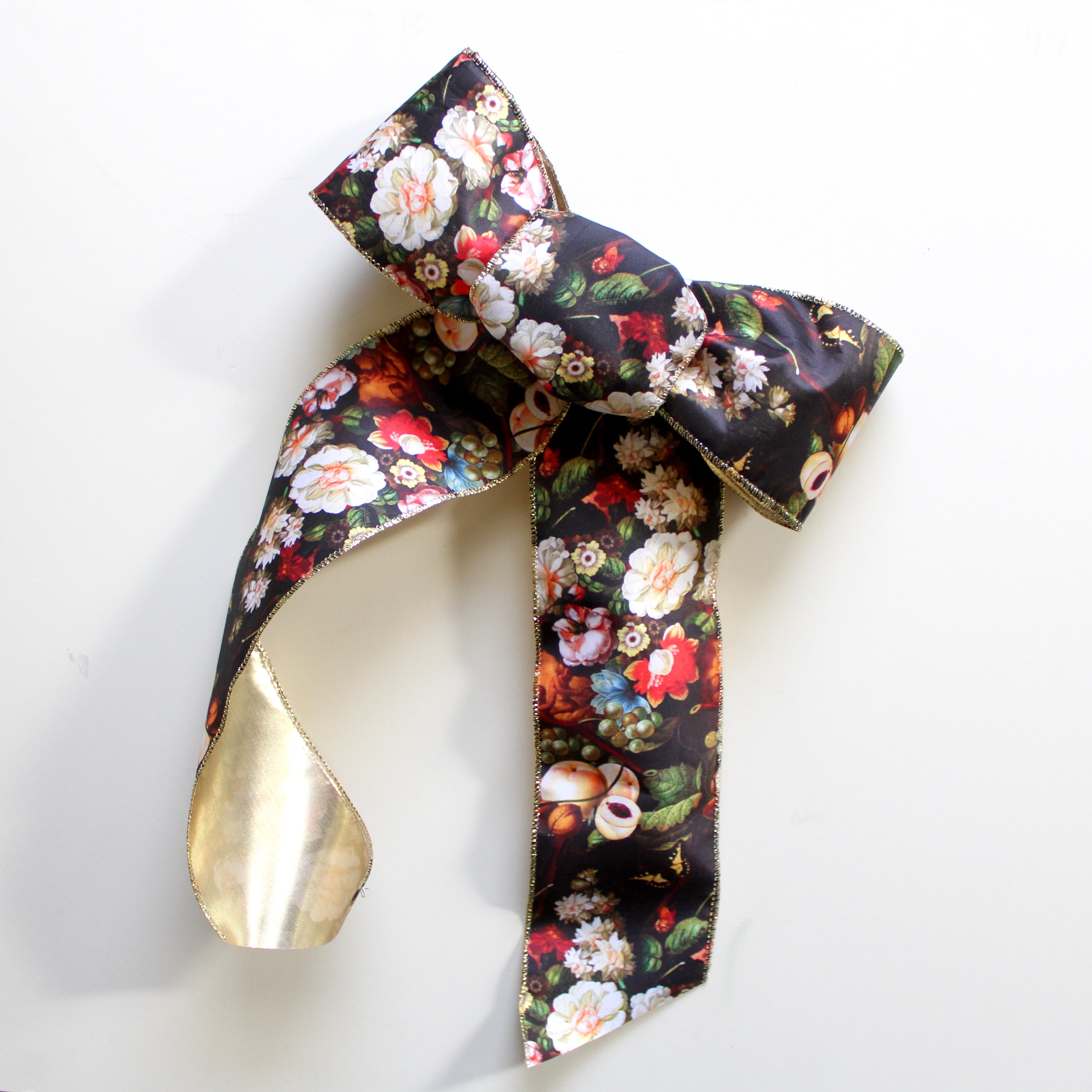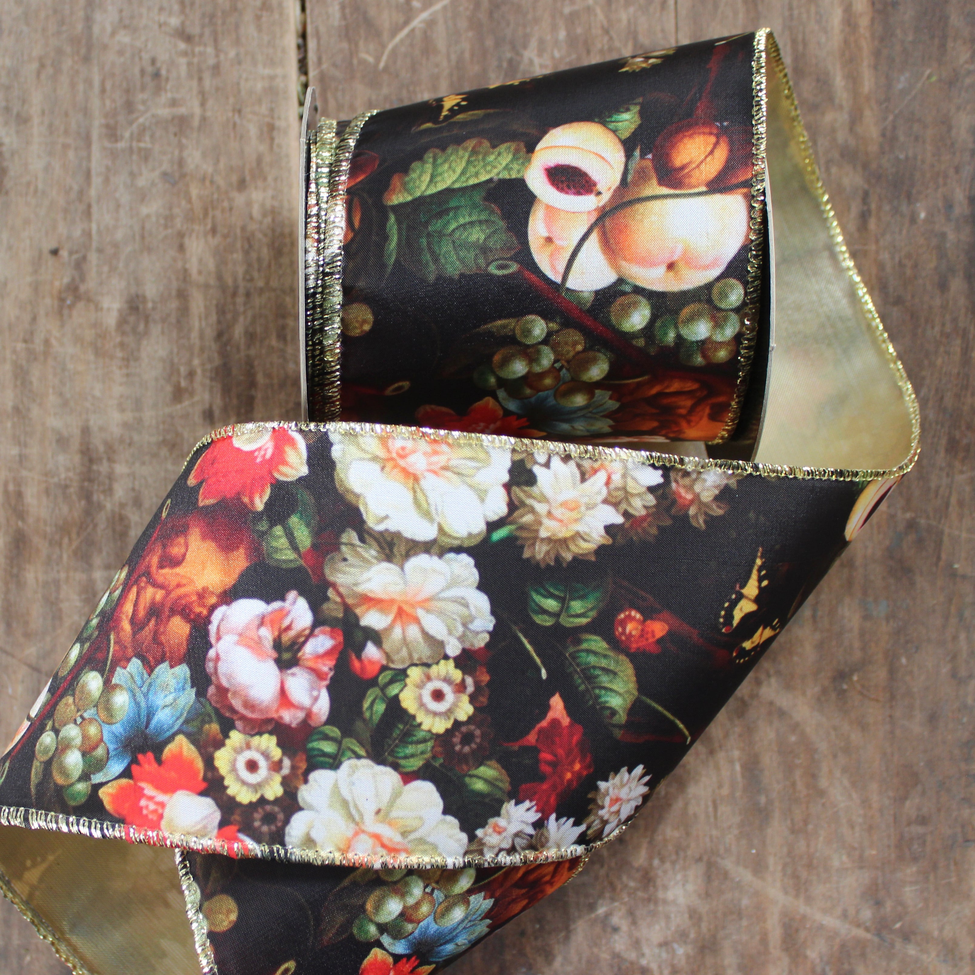 Beautiful, luxurious ribbon with the most delightful Dutch masters design. Fruits, flowers, and butterflies adorn the wide ribbon, a wonderful finishing touch to a wreath, bouquet, or gift.